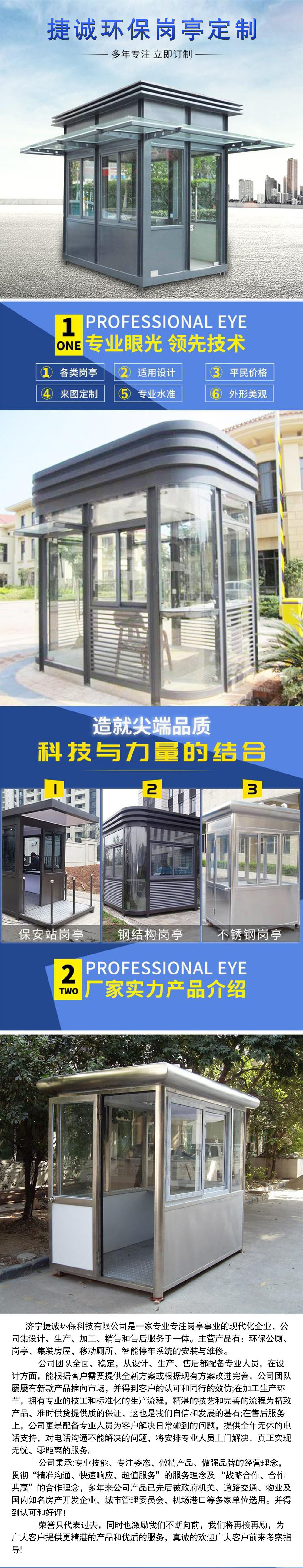 产品详情:泰安岗亭制造商的岗亭,字面含义是指岗亭工作的小房子,一般而言用以住宅物业,购物中心,花园,街道,公共场所等,根据材质,岗亭可以是分成不锈钢岗亭,彩钢岗亭,铝合金岗亭,塑钢岗亭,木质岗亭,按用处可分成保安岗亭,保安员,收费员,店员,警卫,站岗护卫和吸烟警卫,也是一种保护措施,用以保护安保人员不受风吹雨淋,可以提高人们的公共安全性,即加强人们的安全感和维护秩序利于防范和预防犯罪等,同时也可以起到干净城市的功用,让人们进出时觉得轻松自在。